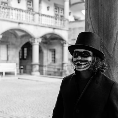 The Man Who Laughs 31. October 2022 by Alexey Kn The Man Who Laughs Categories: Event, Fashion, Fun, Outside • Tags: autumn, black and white, friends, Stuttgart