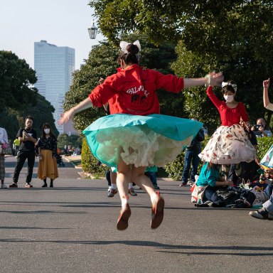 Greased pompadour/ducktail haircuts and Japanese rock and roll from the 50s… They are yet another touristic highlight of Tokyo – the dancing rockabilliy gangs in the Yoyogi Park. These fellers here call their gang “Fairlady”…