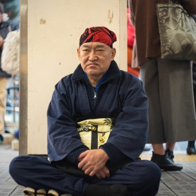 Just when you start thinking I am only photographing pretty girls… OK, you already convinced that I am only photographing pretty girls. Then how about this? Here is a grumpy old man sitting on the floor in front of the Ueno Sta. exit in Tôkyô, Japan. Take notice of his bandanna! :D