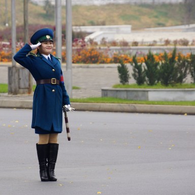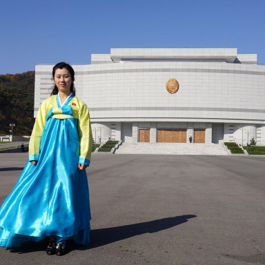 Auf meiner Reise durch Nordkorea vor ein Paar Jahren habe ich etliche Museen, ein Mausoleum, eine Meer-Schleuse, eine Vorzeige-Kolchose und einige historische Stätten besucht. Das eben, was allen Touristen aus dem Westen gezeigt wird. An jedem Ort gab es eine Dame in der koreanischen Nationaltracht, die die Anlagen/Exponaten zeigte und erklärte. Ich stellte für mich ein Muster fest: Je propagandistisch wichtiger und seriöser der zu besuchender Ort war, desto dunkler und oma-nachthemd-hafter waren die Trachten der lokalen Reiseführerinnen.